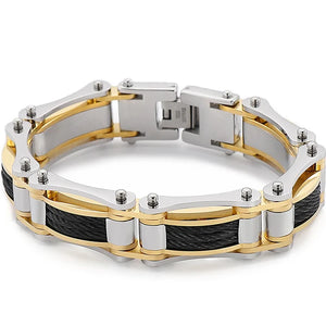 Elevate your style with the Titanium Fusion Cable Bracelet, a bold blend of power and precision. Crafted from high-grade stainless steel, this bracelet features interwoven metallic cables inspired by industrial strength and modern luxury. Each link is polished to perfection, combining black, gold, and silver tones that complement any outfit—from business casual to streetwear.