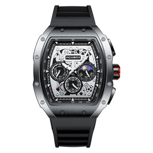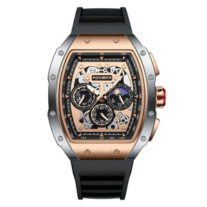 Experience bold innovation and mechanical artistry with the Foxbox Titan Skeleton Chronograph. This luxury timepiece features a tonneau-shaped case crafted from rose gold-tone stainless steel, framed with a brushed silver bezel and secured by precision screws. The multi-functional dial reveals a skeletonized design with intricate gears and exposed mechanics, exuding sophistication and strength.