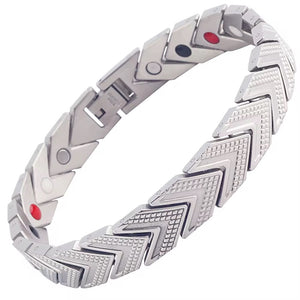 Experience the perfect fusion of style and wellness with the ChevronFlex Magnetic Therapy Bracelet. Designed with precision-cut chevron links and built from premium stainless steel, this bracelet doesn’t just look good — it works hard to support your health. Each piece contains powerful magnets, germanium, far infrared, and negative ions known to promote pain relief, improved circulation, and natural energy balance.
