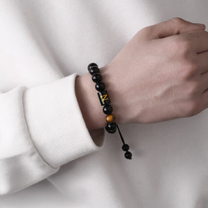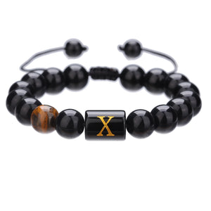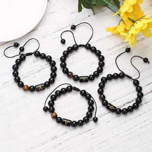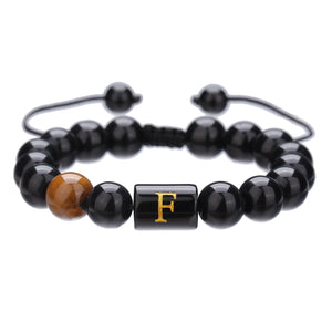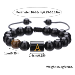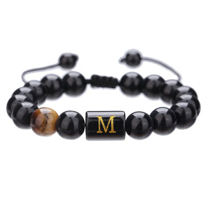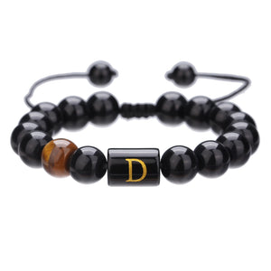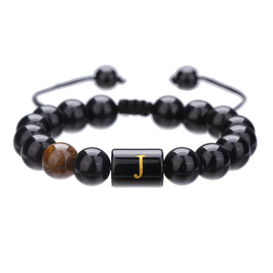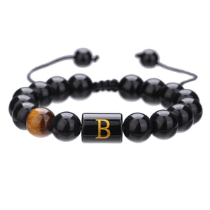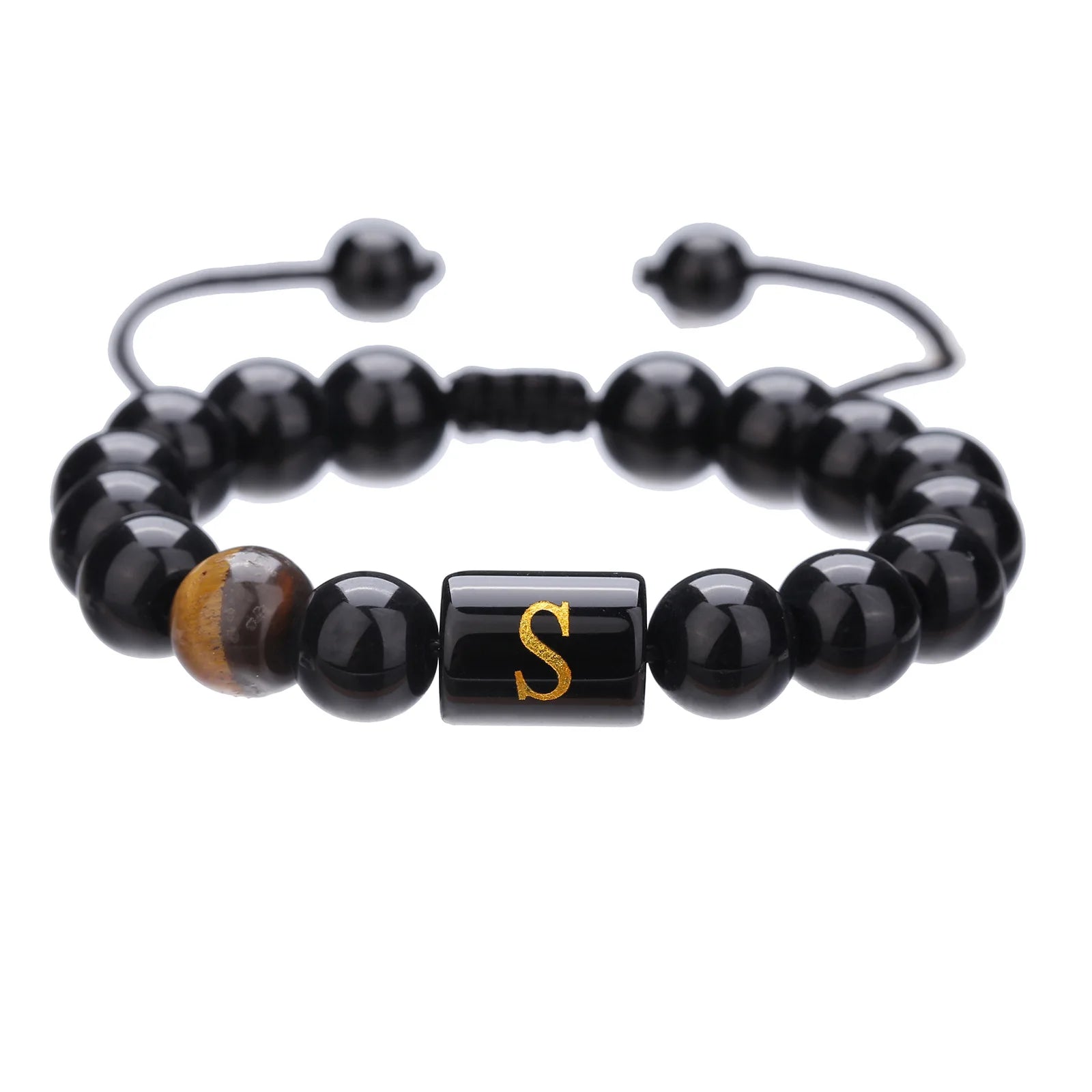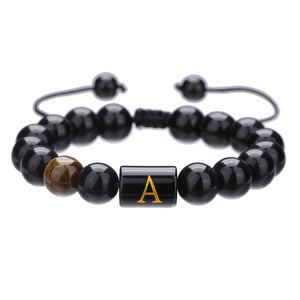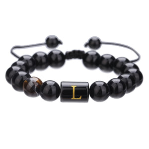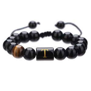 Celebrate individuality with the Onyx Initial Adjustable Braided Bangle – A to Z Collection. This elegant bracelet features polished black onyx beads, renowned for their grounding and protective qualities, paired with a bold Tiger Eye accent bead for strength and clarity. At the center lies a high-gloss black charm engraved with your chosen letter from A to Z in radiant gold — perfect for personal initials, loved ones, or meaningful monograms.