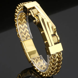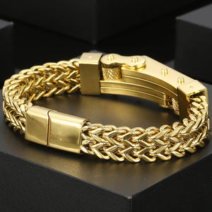 Shine with confidence wearing the Aureum Titan Bracelet, a gold-toned masterpiece that radiates luxury and boldness. The intricate woven chain pairs with its geometric clasp for a statement of prestige and sophistication. Designed for those who embrace success, this bracelet elevates any outfit with a golden touch of power.