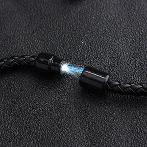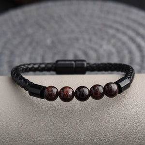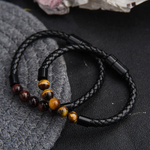 Minimalist power meets timeless strength in the Midnight Tiger Eye Steelcore Bracelet. Featuring a sleek combination of braided black leather and polished stainless steel accents, this bracelet is centered with five rich Tiger Eye stone beads — known for enhancing focus, courage, and protection.