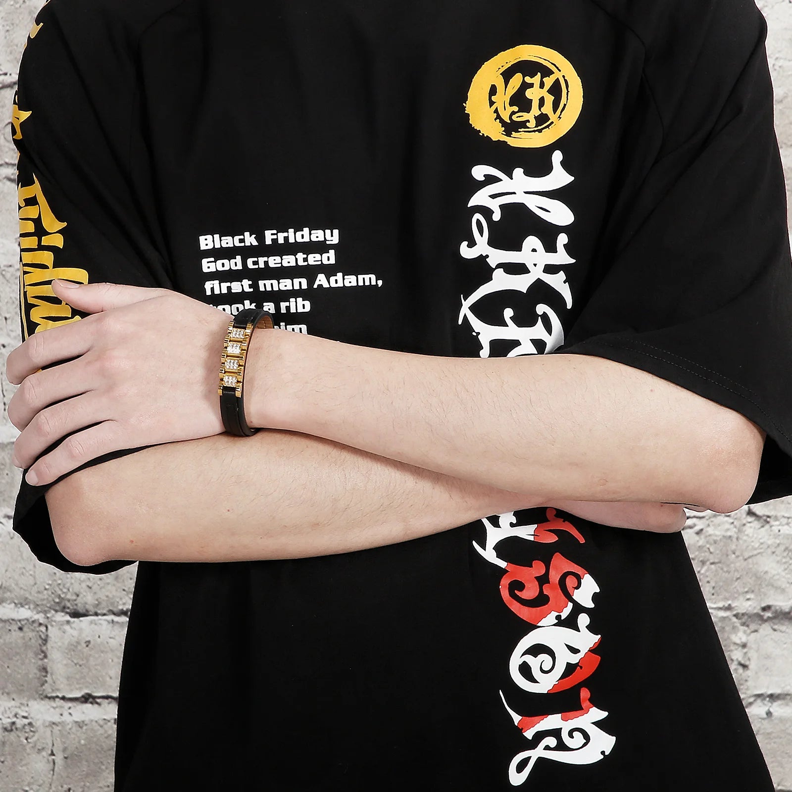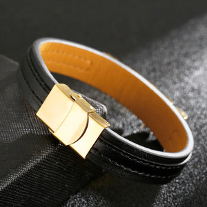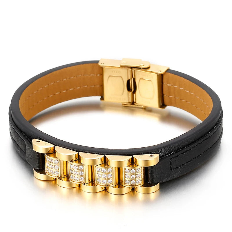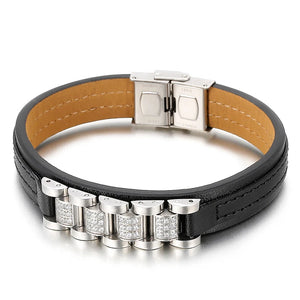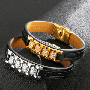 Elevate your style with the Eclipse Luxe Leather Bracelet, a perfect fusion of modern masculinity and timeless sophistication. Crafted from premium black leather, this bracelet features a bold central design with stainless steel accents inlaid with shimmering cubic zirconia for a subtle yet luxurious sparkle. The secure fold-over clasp ensures all-day comfort and durability, making it ideal for both casual and formal wear.
