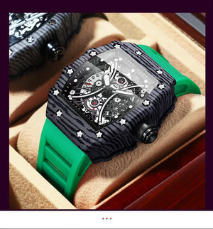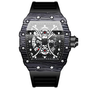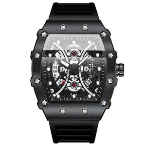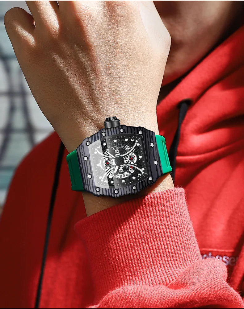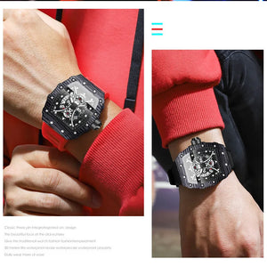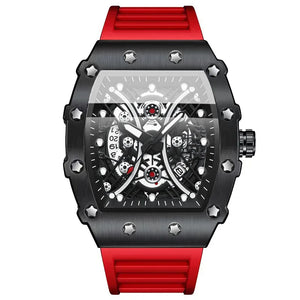 The Epoch IronForge Skeleton Automatic features a rugged tonneau case, exposed mechanical movement, and striking red accents for a powerful industrial look. Built with reinforced screws and a durable silicone strap, this watch delivers precision performance and fearless modern style.