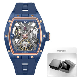 The Epoch AeroSkeleton Automatic showcases a fully exposed mechanical movement inside a sleek tonneau-shaped case. Designed with luminous markers and a high-comfort silicone strap, this watch delivers elite performance and standout style in every moment.