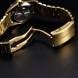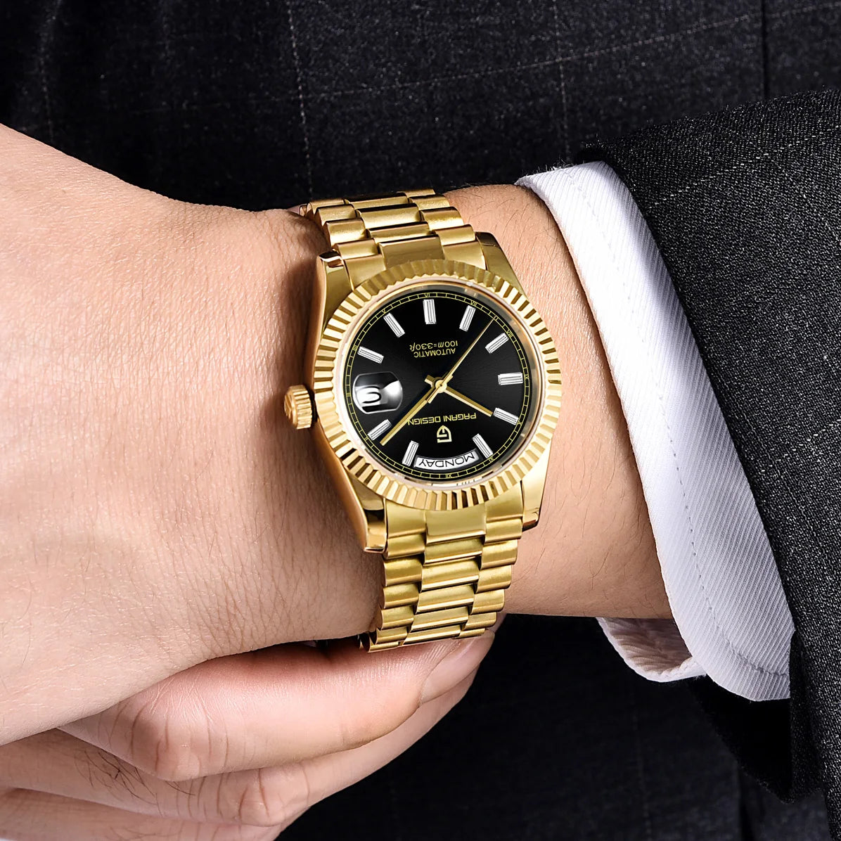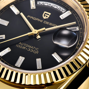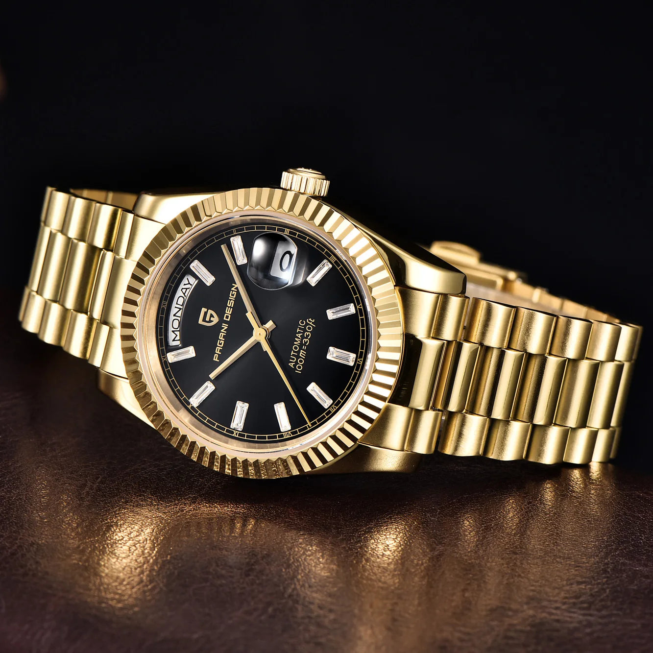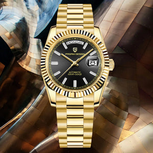 The PAGANI Design Calendar Auto seamlessly blends classic aesthetics with modern functionality. Featuring a robust stainless steel case, this timepiece boasts a dual calendar function—displaying both the day and date—powered by a reliable automatic movement. The AR-coated sapphire crystal ensures clarity and scratch resistance, while its 100M water resistance offers versatility for various activities. Whether dressing up for a formal event or adding a touch of sophistication to everyday wear, this watch stands as a testament to enduring style and precision.