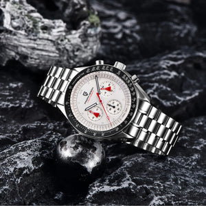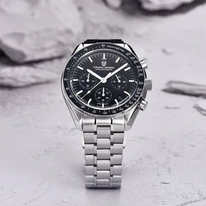 The PAGANI Design Quartz Chrono combines sporty style with precise quartz movement. Featuring a durable all-steel build, sapphire mirror, and waterproof design, this automatic date chronograph is perfect for active men who value performance and elegance.