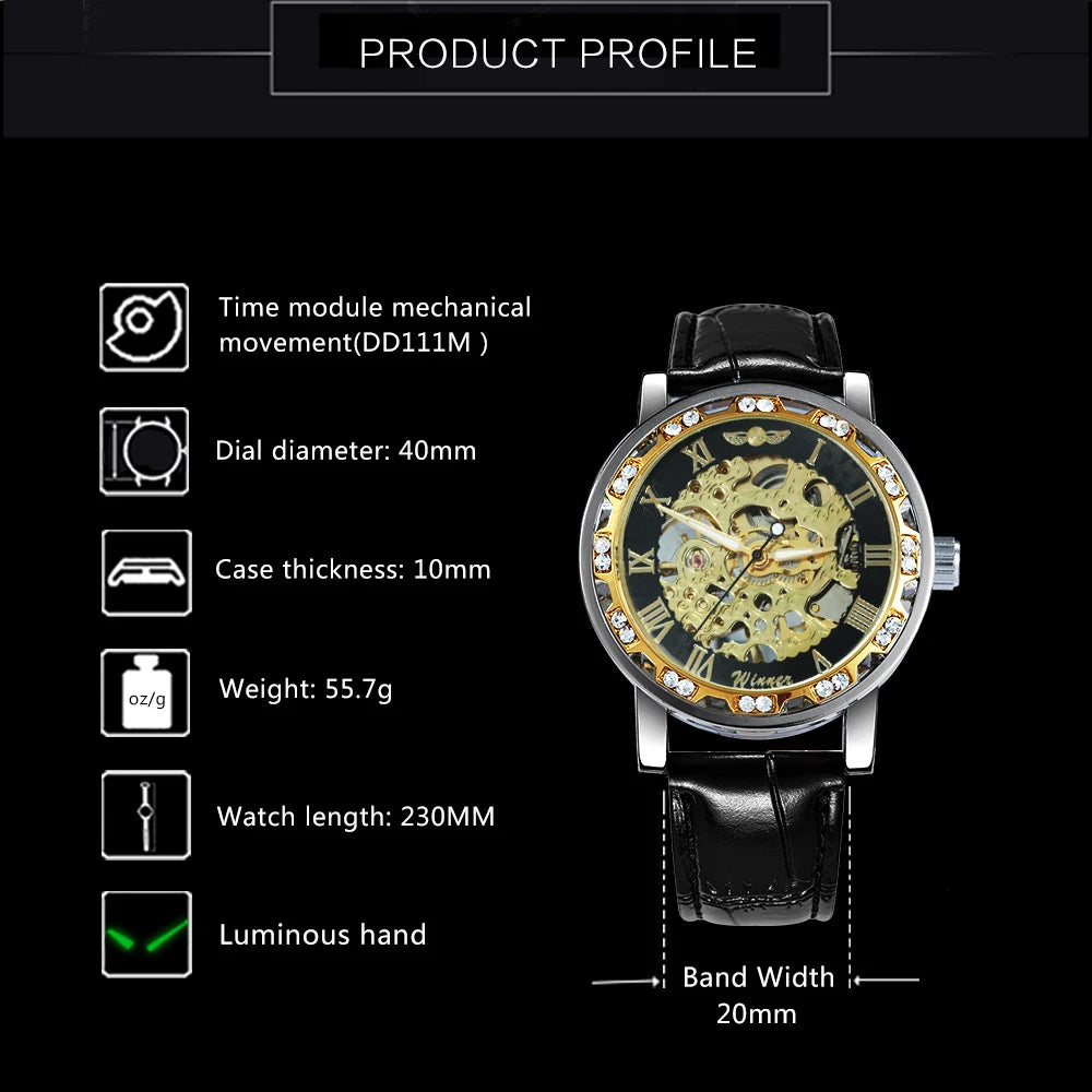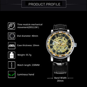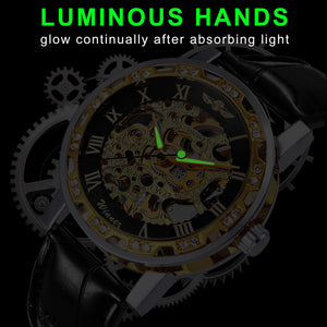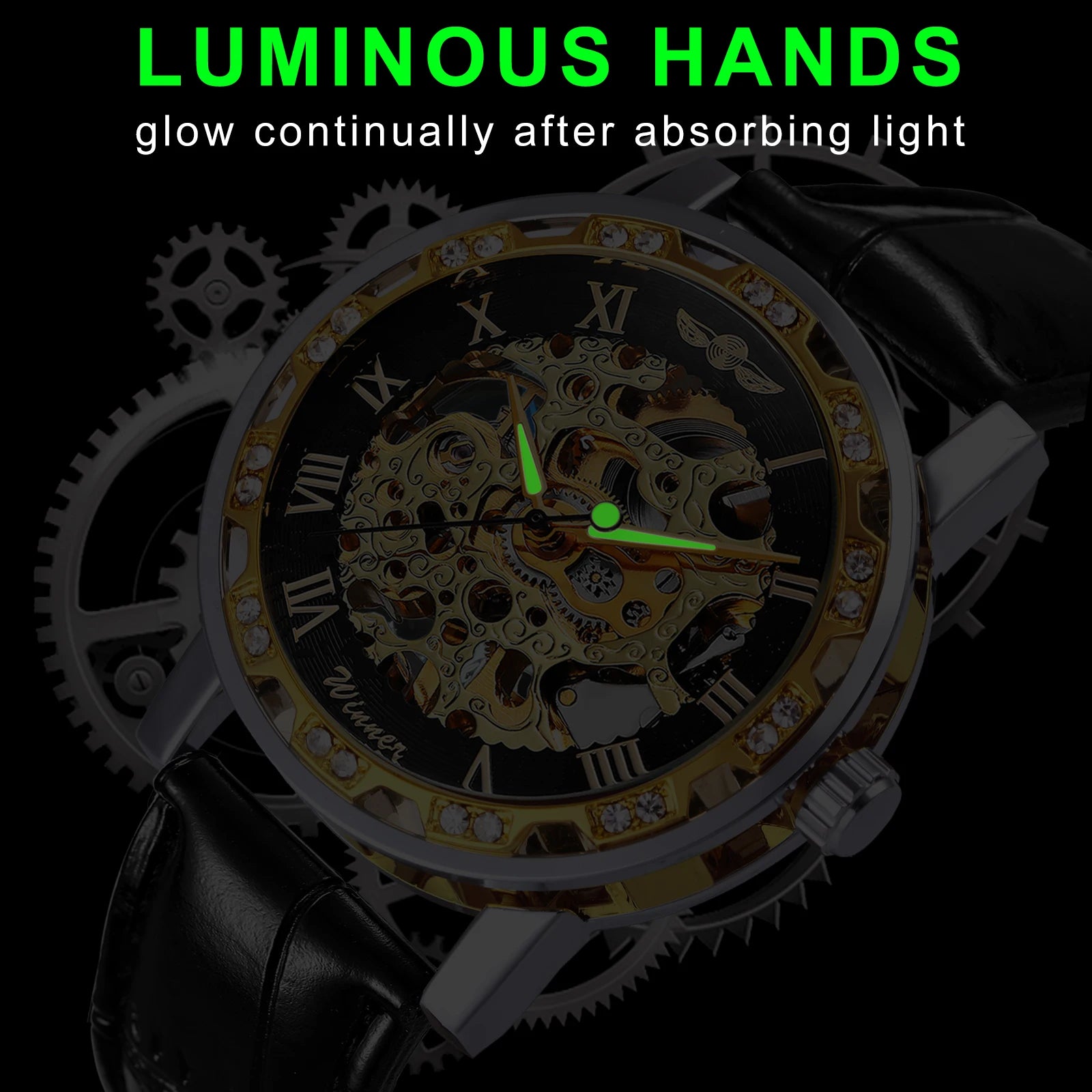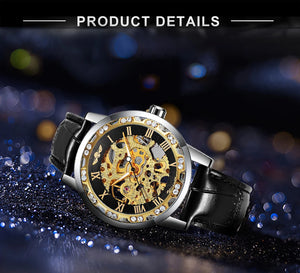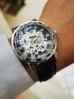 Elevate your wristwear with the Geneva Epoch Skeleton Luxury Watch — a bold fusion of sophistication and mechanical artistry. This timepiece features an intricately designed gold-tone skeleton dial, showcasing the inner workings through precision-engineered gears and movements. Surrounded by a bezel adorned with sparkling crystals and paired with a classic Roman numeral display, it exudes both luxury and craftsmanship. Encased in polished stainless steel and complemented by a genuine black leather strap, this automatic watch offers timeless elegance and a commanding presence for the modern gentleman. Perfect for formal occasions or luxury everyday wear.