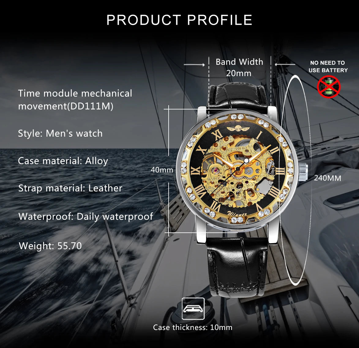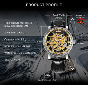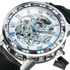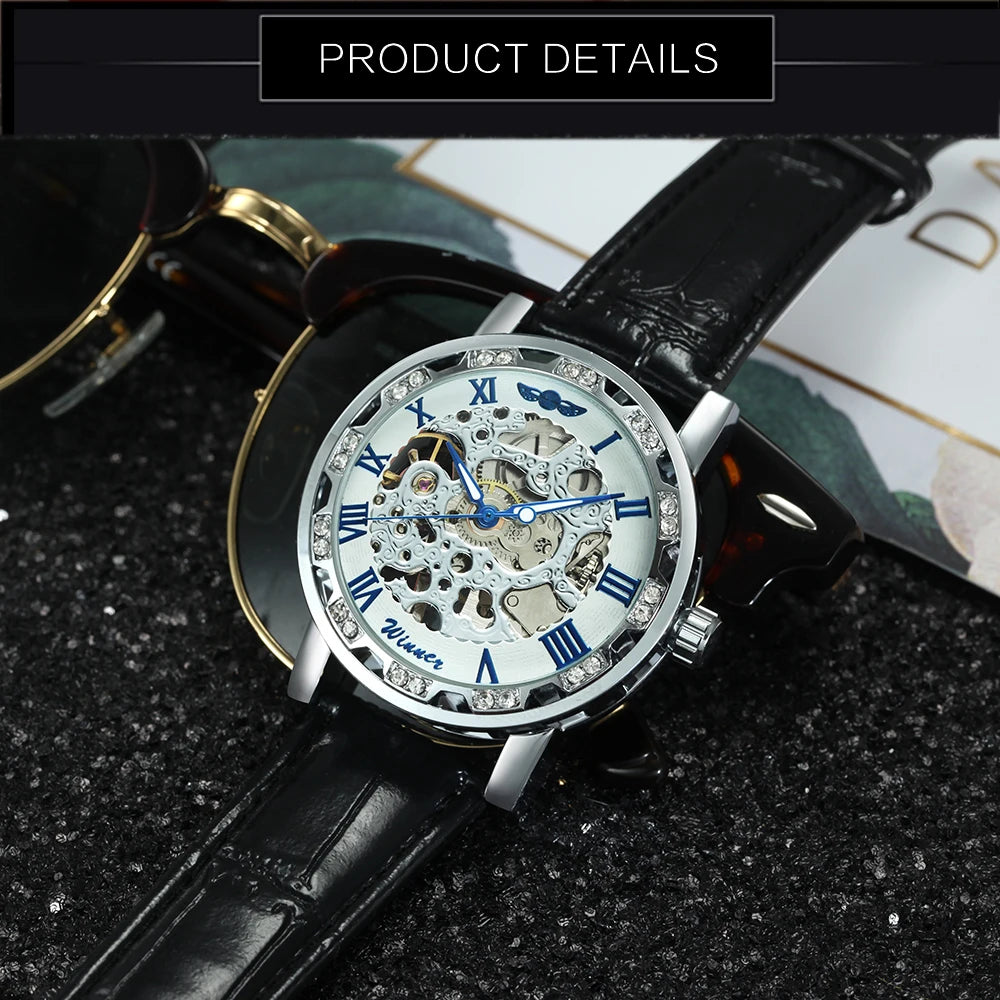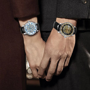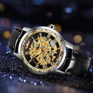 Unveil the art of timekeeping with the Imperial Skeleton Luxe Watch — a striking fusion of classic elegance and modern craftsmanship. Featuring an intricately designed skeleton dial, this timepiece showcases its golden mechanical movement encased in a polished silver bezel adorned with dazzling crystals. Roman numeral hour markers and a glossy black leather strap add a touch of sophistication, making it the perfect statement accessory for men who appreciate precision and prestige. Whether you’re at a gala or a business event, this watch reflects both your style and status.